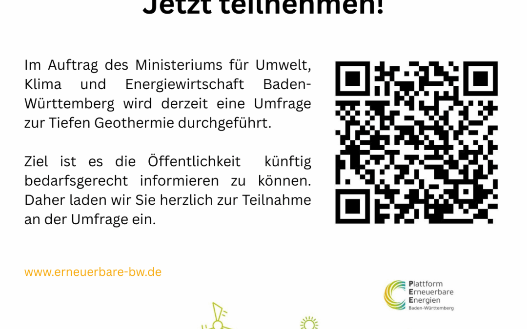 Die Teilnahme ist freiwillig und anonym. Die Plattform Erneuerbare Energien Baden-Württemberg e.V. bittet darum, sich zu beteiligen und den Link gerne auch im persönlichen und beruflichen Umfeld weiterzugeben. Ein breites Meinungsbild hilft dabei, die öffentliche Kommunikation rund um das Thema Tiefengeothermie weiterzuentwickeln.